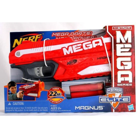 Cooles Design trifft neue mega Blaster-Power: Der NERF Elite Mega Magnus mit den roten Mega-Darts steht für ein Maximum an Reichweite!; 1.1. Der NERF Elite Mega Magnus ist der ultimative NERF-Spaß für alle, die auf mega Reichweite stehen. Dank der drei enthaltenen roten Mega-Darts sind jetzt Flugweiten von 23 Metern und mehr kein Problem. Der knallrote NERF-Blaster ist ein Top-Loader ? ihr müsst einfach den Ladekolben nach hinten ziehen, die drei roten Mega-Darts nacheinander in den Schacht schieben, den Ladekolben nach vorne drücken und schon ist euer Mega Magnus bereit für den ultimativen Blaster-Spaß. Für die Design-Fans unter euch hat der Mega Magnus unter dem Lauf eine Tactical Rail-Schiene, an der ihr NERF-Zubehör aus eurer Sammlung aufstecken könnt (nicht enthalten). Mit verschiedenen coolen Gadgets könnt ihr so eurem Mega Magnus den individuellen, persönlichen Look verleihen.; 1.2. Anschnallen für den Langstreckenflug: Gerade einmal unterarmlang ist der NERF Elite Mega Magnus ein wahres Power-Paket, das bei kompakter Bauart mit enormen Reichweiten überrascht. Nach dem Auspacken fällt sofort sein hohes, gut ausbalanciertes Gewicht auf, das die solide Verarbeitung unterstreicht und gefühlsmäßig erlebbar macht. Neben dem guten Handling wirft der Elite Mega Magnus aber noch weitere Features in die Waagschale: Der sehr hohe Lauf verleiht dem Mega Magnus eine bullige, robuste Optik, die mit einem futuristisch anmutenden Design in Rot-weiß gepaart ist. In dem hohen Lauf verbirgt sich ausreichend Raum für drei der neuen roten Darts aus der MEGA-Serie. Diese werden bei zurückgezogenem Ladekolben einfach von oben in den Schacht gesteckt und schon ist der Top-Loader einsatzbereit. Jeder weitere Dart wird mit einem akustisch markanten ?Ritsch-Ratsch? des Schlittens in den Lauf befördert und ist sofort startklar. Der NERF Elite Mega Magnus bietet reichlich Blaster-Spaß, der sich dank seines satten Gewichts und authentischer Akustik nicht nur stark anfühlt, sondern auch im Blaster-Spiel mit extremer Reichweite beweist.; 1.3. Warnhinweise: Nicht auf Augen oder Gesicht zielen; 1.4. BULLETS: + MEGA Performance für MEGA Reichweite + Mit eingebautem Magazin für 3 MEGA Darts + Mega Reichweite von 25 m + Inklusive 3 NERF N-Strike Elite MEGA Darts; Bilder: 1.0. 1.
