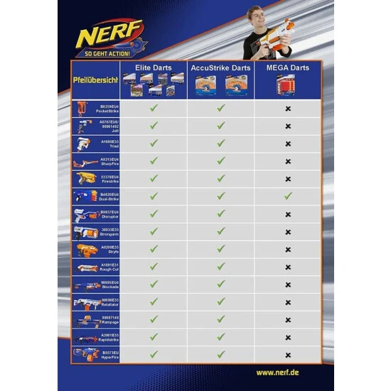 Achtung! Nicht für Kinder unter 3 Jahren geeignet. Verschluckbare Kleinteile. Erstickungsgefahr! Achtung! Nicht auf Augen oder Gesicht zielen. Um Verletzungen zu vermeiden: Nur Darts oder Pfeile verwenden, die speziell für dieses Produkt entwickelt wurden. Darts, Pfeile und Blaster nicht verändern. Die Schussweiten sind Schätzwerte und basieren auf Testdaten. Die tatsächlichen Ergebnisse des Blasters sind unterschiedlich und hängen vom Zustand der Darts und anderen Faktoren ab.