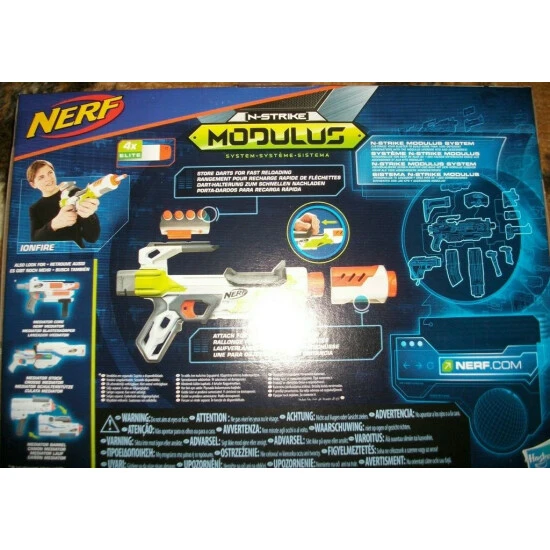Bau deinen eigenen Blaster – mit den Modulus Blastern von NERF! Der N-Strike MODULUS IonFire kommt nicht nur in einer feurigen Farbgebung, sondern liegt dank seiner schlanken und ergonomischen Form auch extrem gut in der Hand. Als kleiner Bruder des Modulus ECS-10 Blasters (separat erhältlich) wartet der IonFire mit einer abnehmbaren Laufverlängerung sowie einer Dart-Halterung auf, welche an der Ober- oder Unterseite angebracht werden kann. Die Tactical Rail Steckschiene an der Oberseite verleiht dem IonFire ein extravagantes Design und lässt ihn besonders futuristisch wirken. Er ist kompatibel mit den meisten Modulus Zubehörteilen (separat erhältlich), sodass dem Bau eines individuellen Blasters nichts im Wege steht. Der IonFire schießt jeweils 1 Dart ab und kommt mit 4 Darts, Laufverlängerung und Darthalterung.
