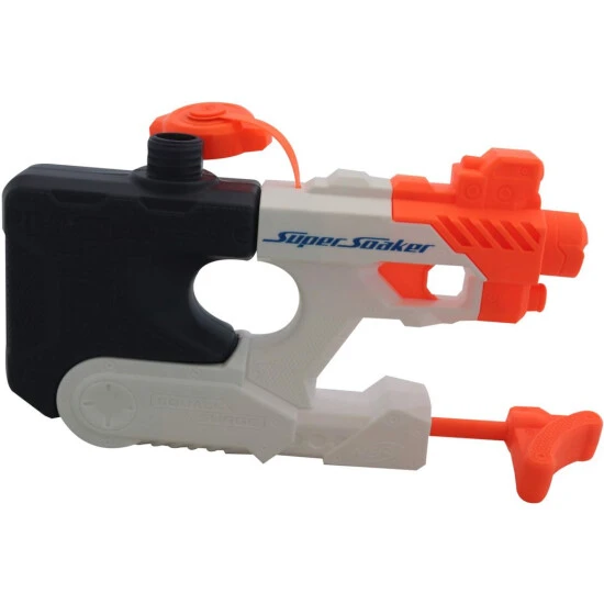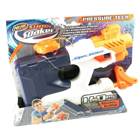 Der Squall Surge aus der H2OPS-Serie von Super Soaker ist der kleine Bruder des größeren Tornado Scream, steht diesem aber in nichts nach. Auch hier heißt es dank des innovativen „Pressure Tech“ Systems: Füllen, pumpen, schießen! Bei einem Tank von ca. 600 ml sorgt der kleinere H2OPS Blaster sogar für eine noch größere Reichweite. Der Squall Surge macht die Mitspieler sogar aus einer Entfernung von bis zu 10,6 m noch nass.